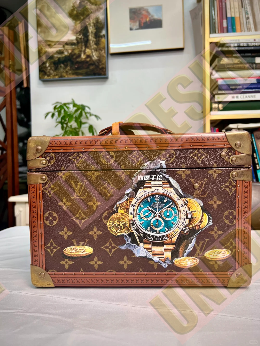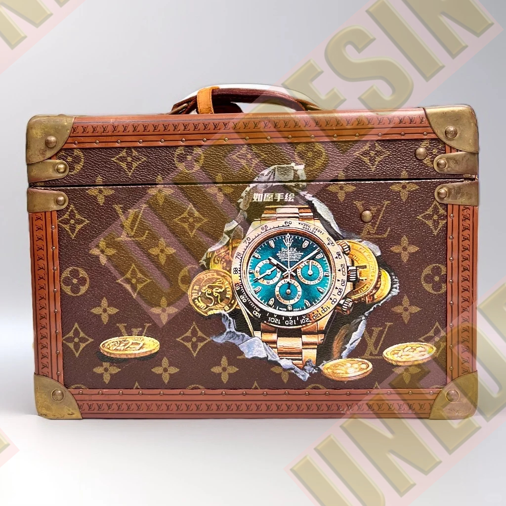 The “Time Vault” Watch Trunk Edition by Unedesin × LV pays homage to horological excellence and heritage craftsmanship. At its heart, a meticulously illustrated Rolex—its bezel gleaming, its movement alive—is cradled within a classic LV trunk rendered in warm monogram tones and golden hardware accents. This piece speaks of legacy, precision, and protection—transforming a watch from a mere accessory into a sacred heirloom. Whether gifted to a collector or commissioned as a tribute, it celebrates the kind of time that deserves to be encased in art.